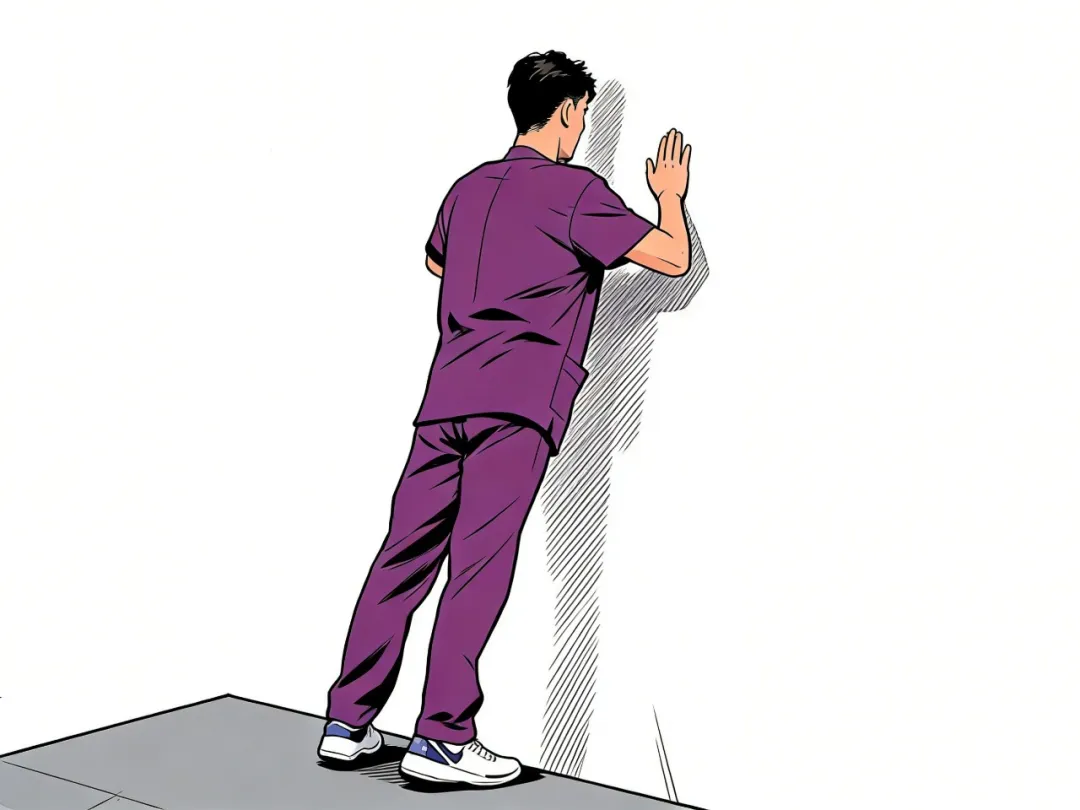双手抬起与肩同宽,指尖触墙后,手掌平放在墙上。弯曲手肘,直到前额轻触墙面。训练时注意收腹、沉肩,保证身体成一条直线。