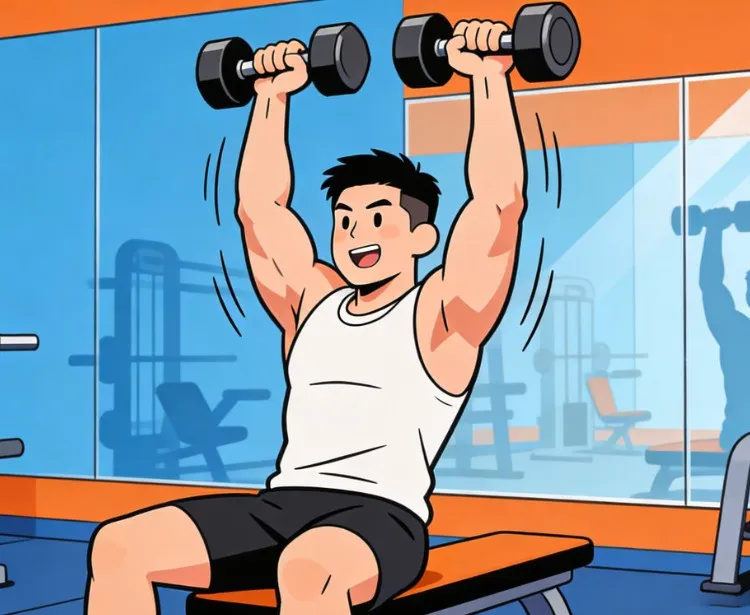 坐或站立,双手持哑铃或水瓶举至肩高,掌心向前,向上推至头顶直至肘部最终伸直,缓慢放下。这个动作可以改善肩颈紧张,并且加强上肢的肌肉力量。